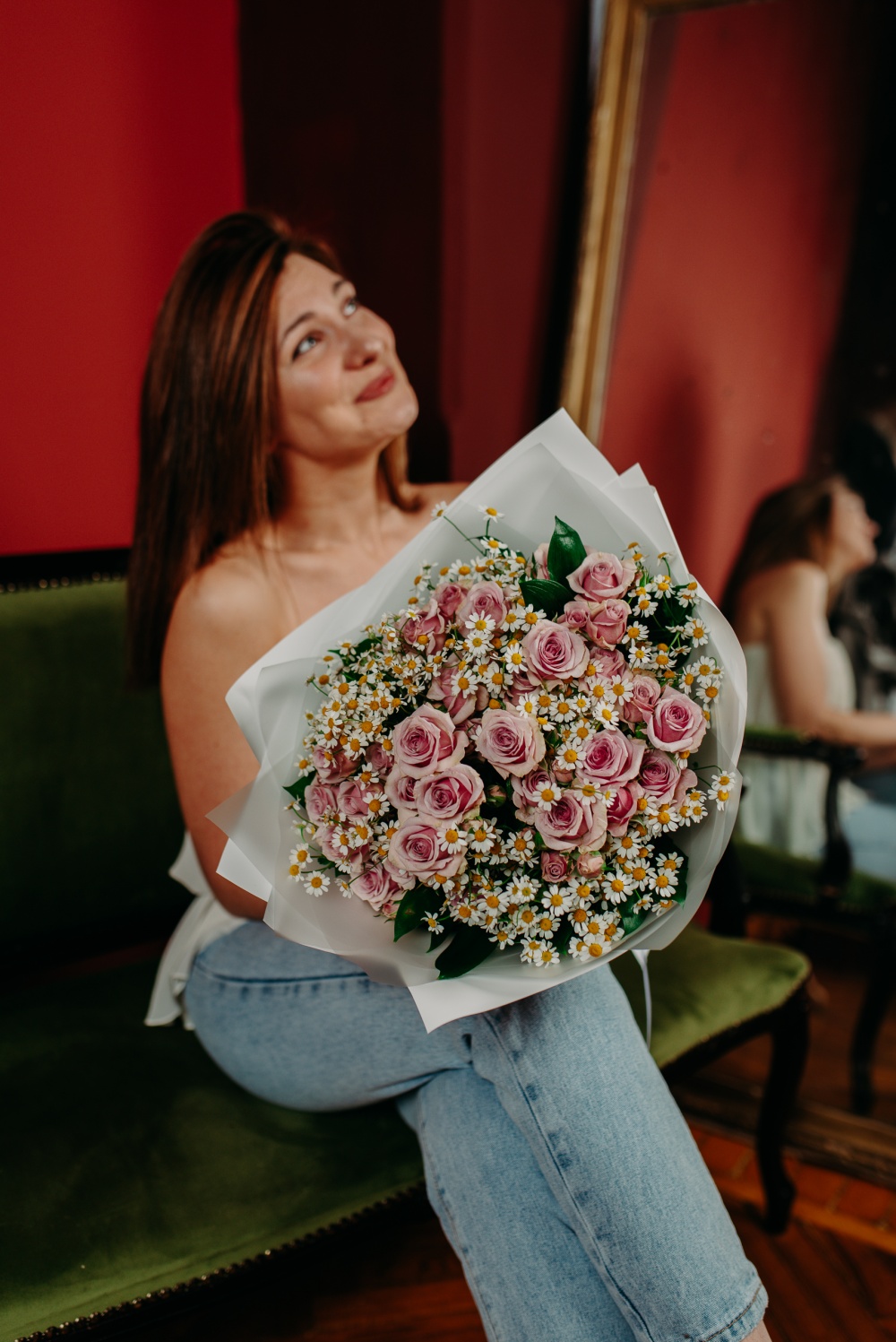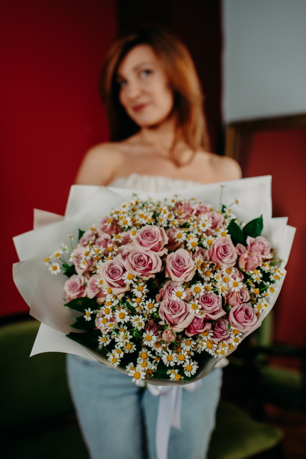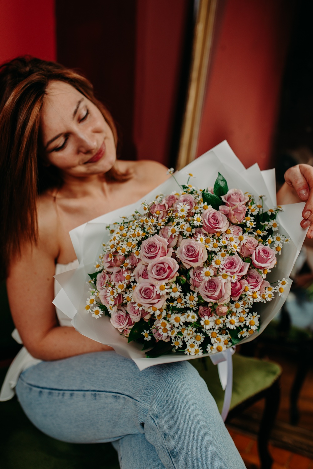Букет из кустовых роз и кустовой ромашки