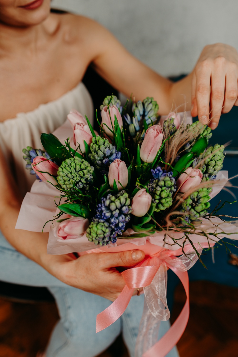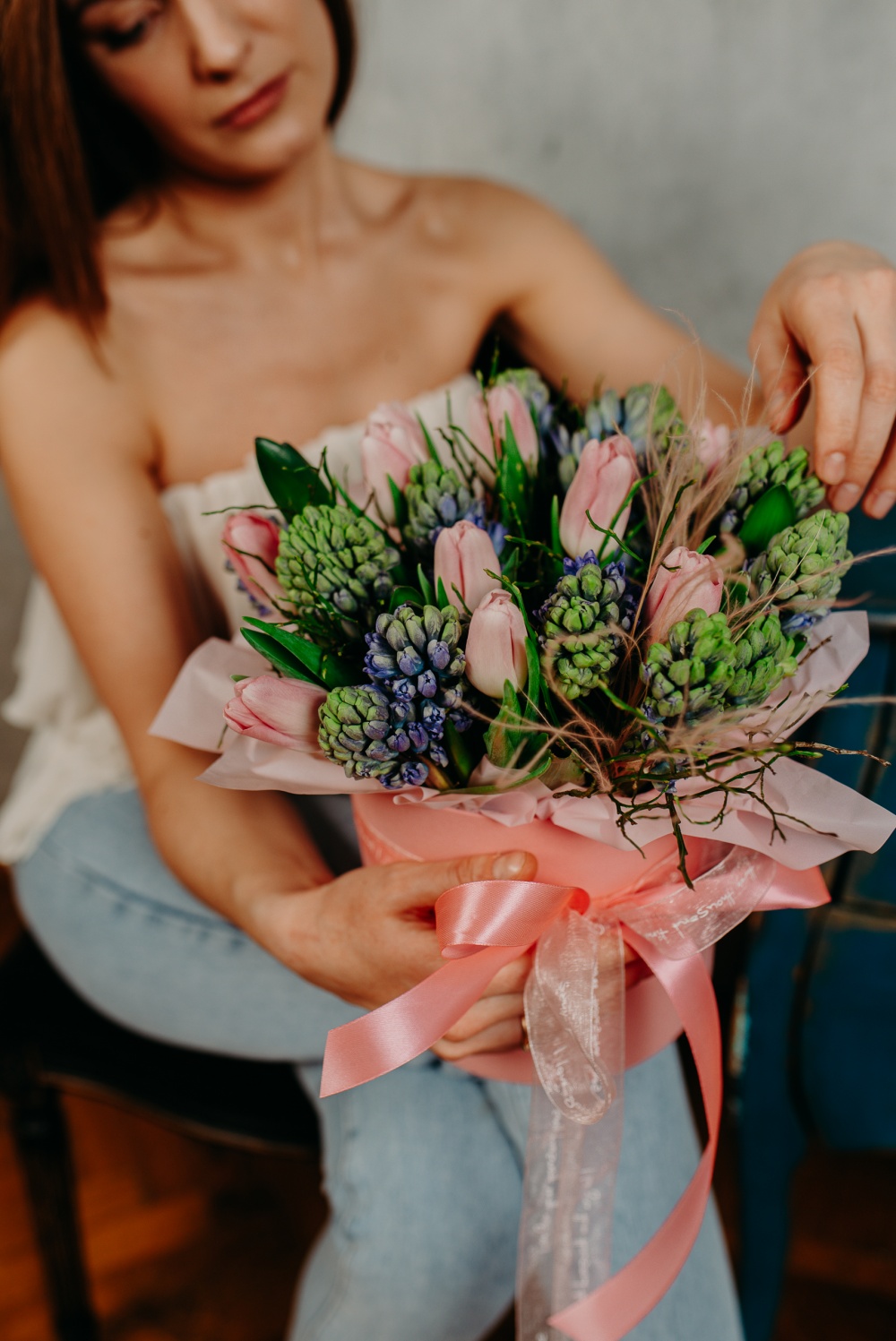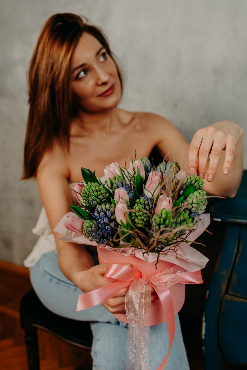 Ароматные гиацинты и нежные тюльпаны в шляпной коробке