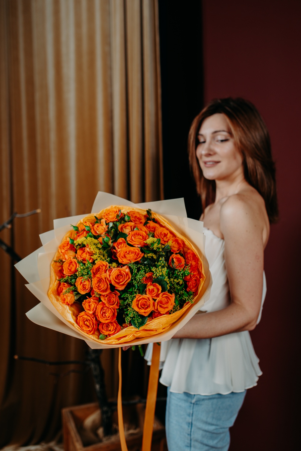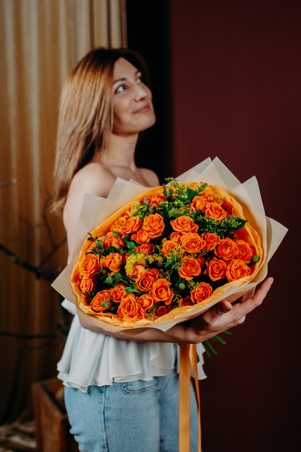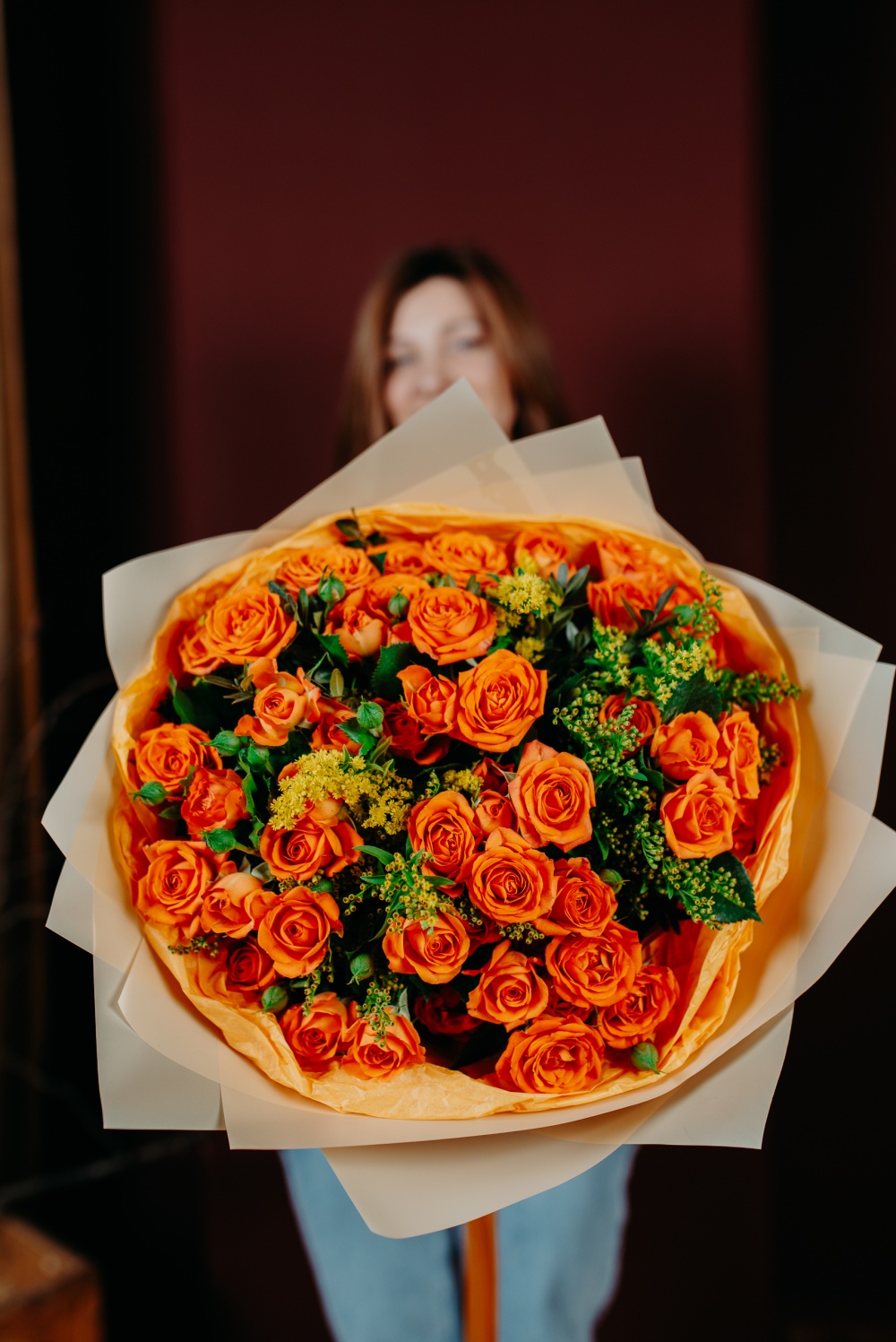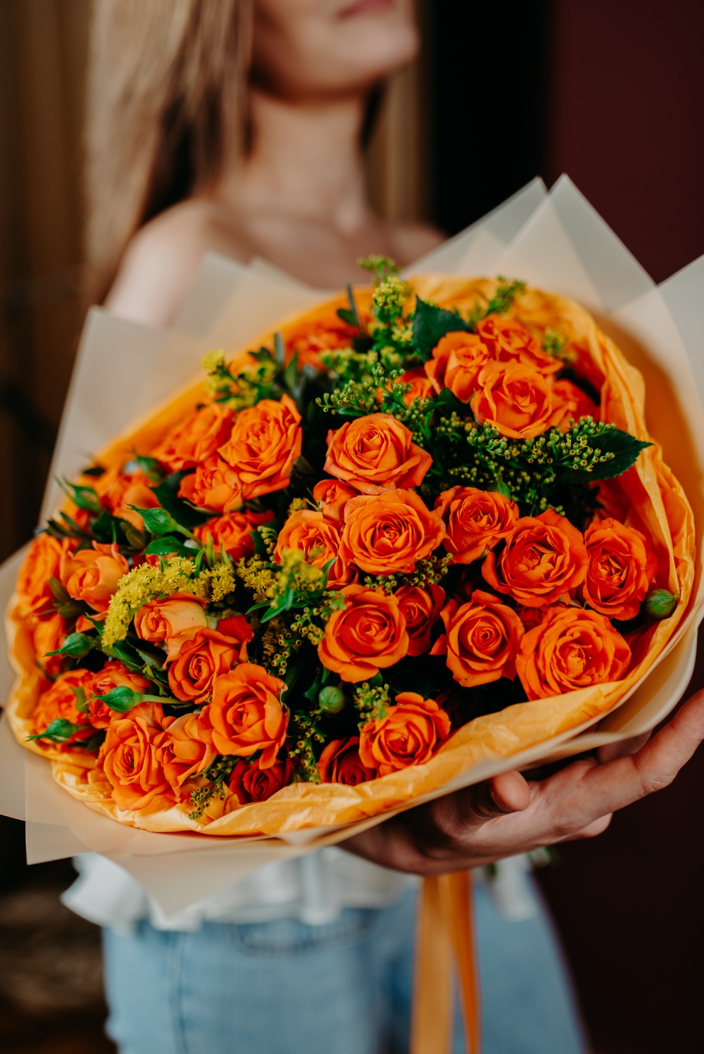 Кустовые розы апельсинового цвета в сочетании с солидаго цвета солнца - яркое сочетание, которое поднимет настроение в самый хмурый день. В комплект входит: инструкция по уходу, открытка с вашими пожеланиями. Букет можно заказать с доставкой до двери или самовывозом из магазина. Доставка цветов по Москве бесплатно в пределах МКАД.
