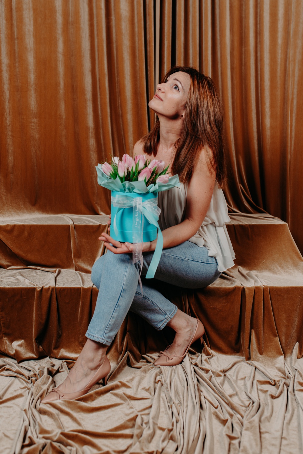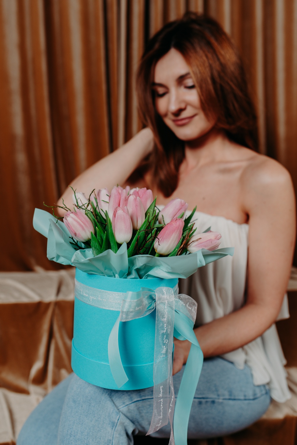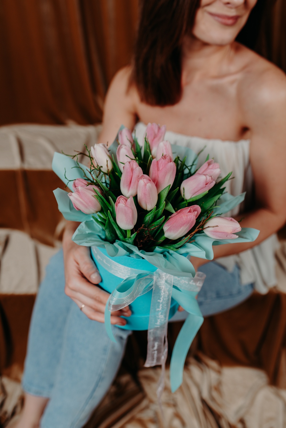 Композиция с розовыми тюльпанами в шляпной коробке
