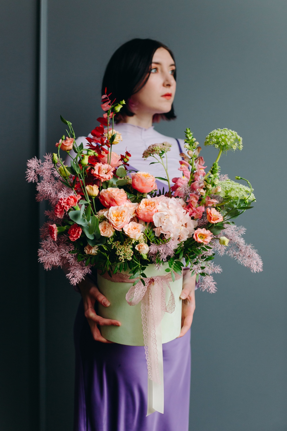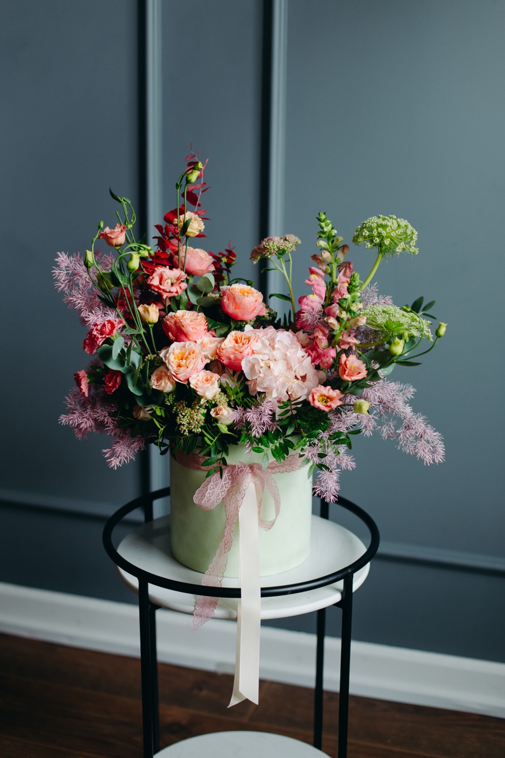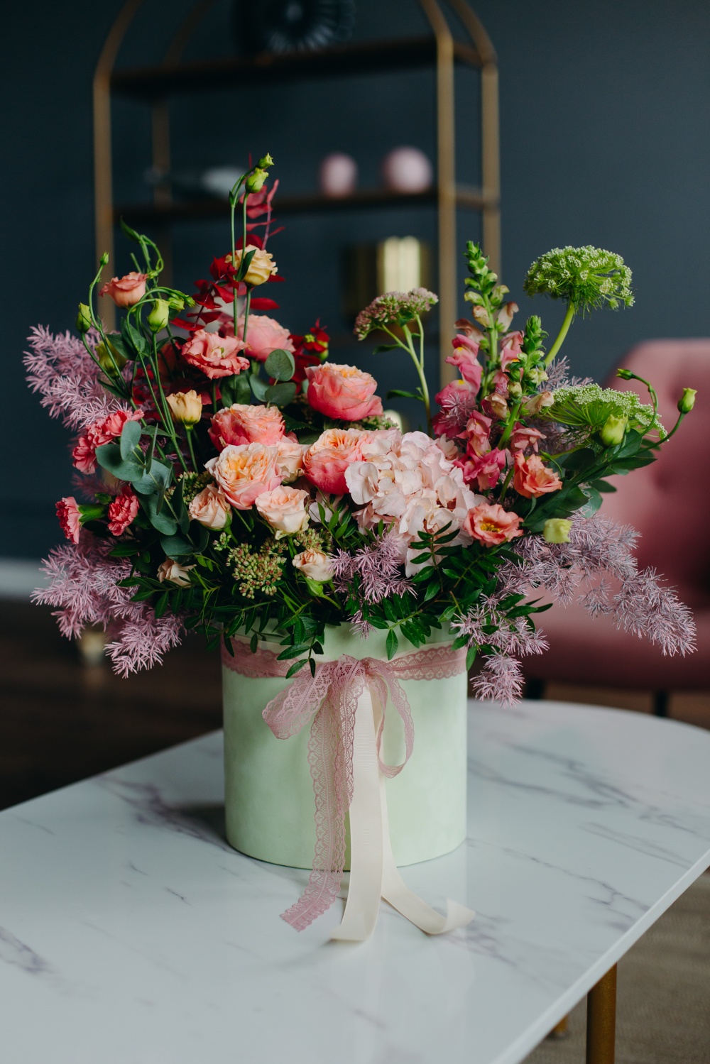 Заказать композицию «Каприз» стоит для произведения незабываемого впечатления. Она вобрала в себя всю нежность, очарование, целеустремленность легких цветов и яркость лепестков гортензии, лизиантуса, розы кустовой, аспарагуса. Белая коробка привлечет к себе внимание и создаст праздничное настроение.