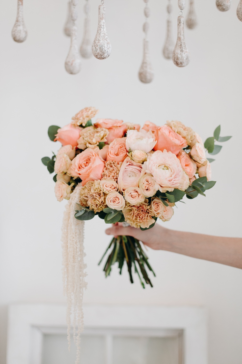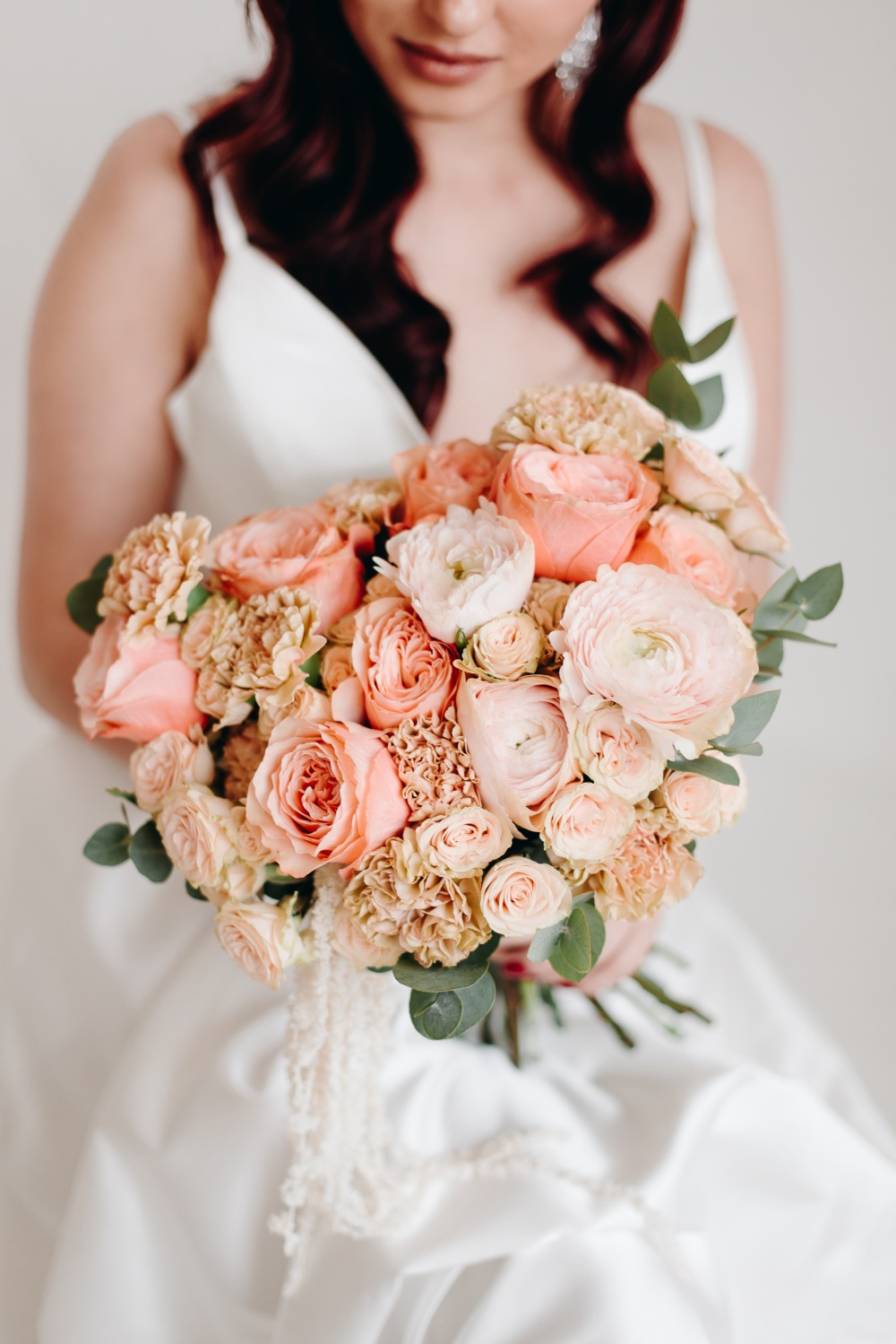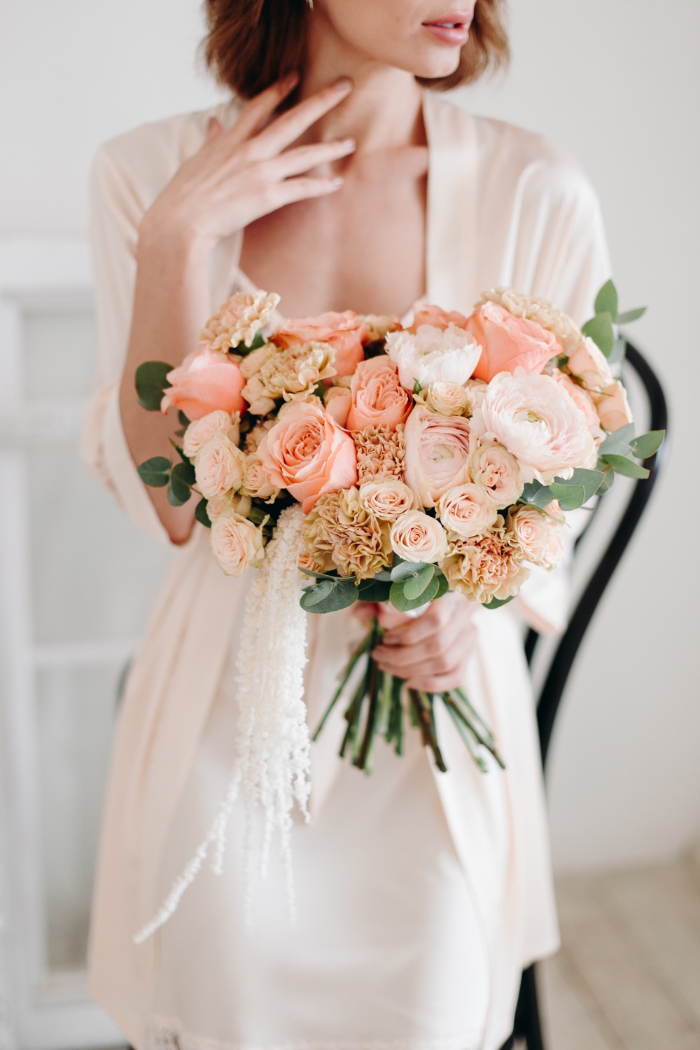 Свадебный букет "Пунш" в персиково-белой палитре. В состав букета входят: пионовидные розы, гвоздики, ранункулусы, кустовая роза, эвкалипт. Дополняет букет кружевная лента. В комплект входит: инструкция по уходу, открытка с вашими пожеланиями. Букет можно заказать с доставкой до двери или самовывозом из магазина. Доставка цветов по Москве бесплатно"