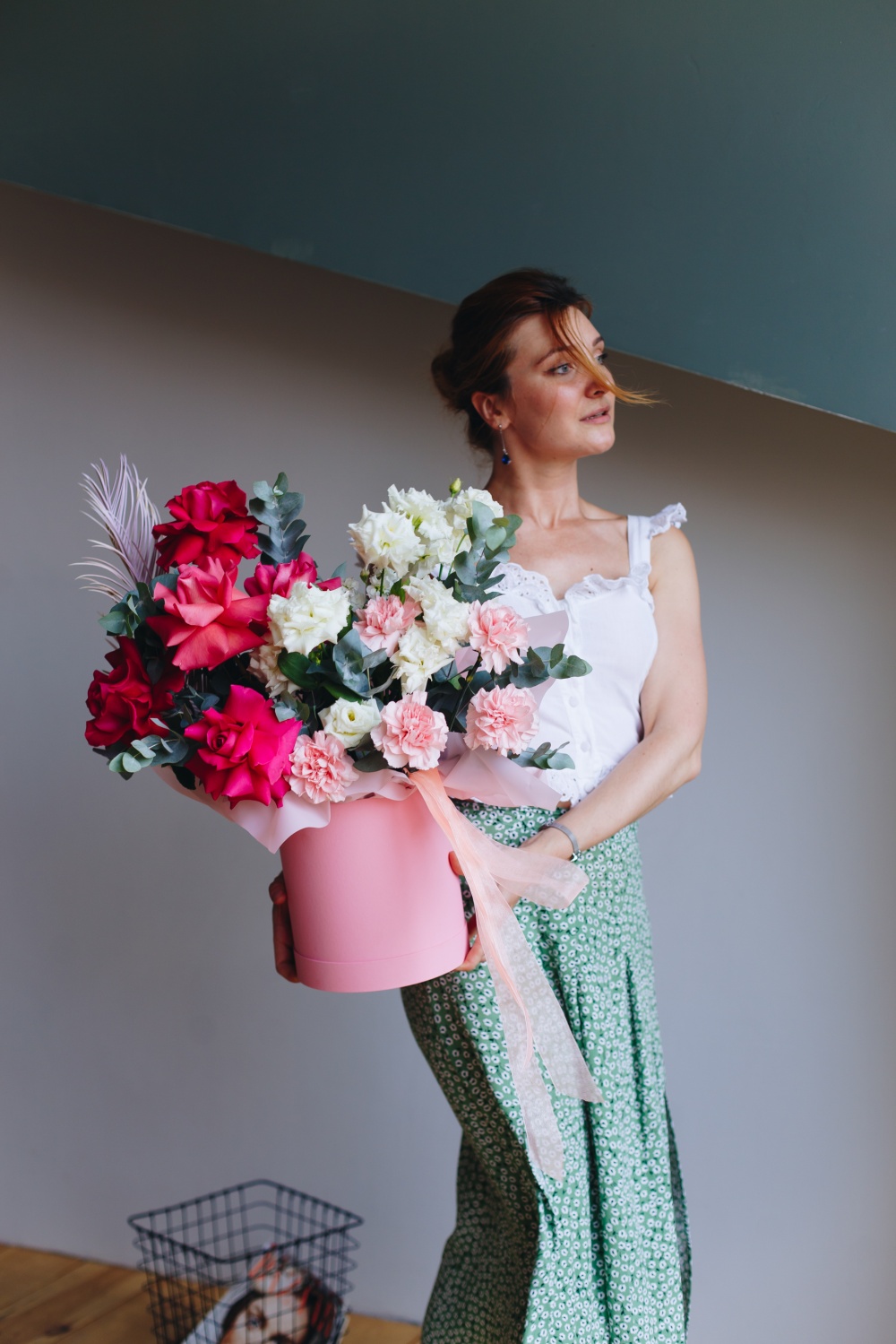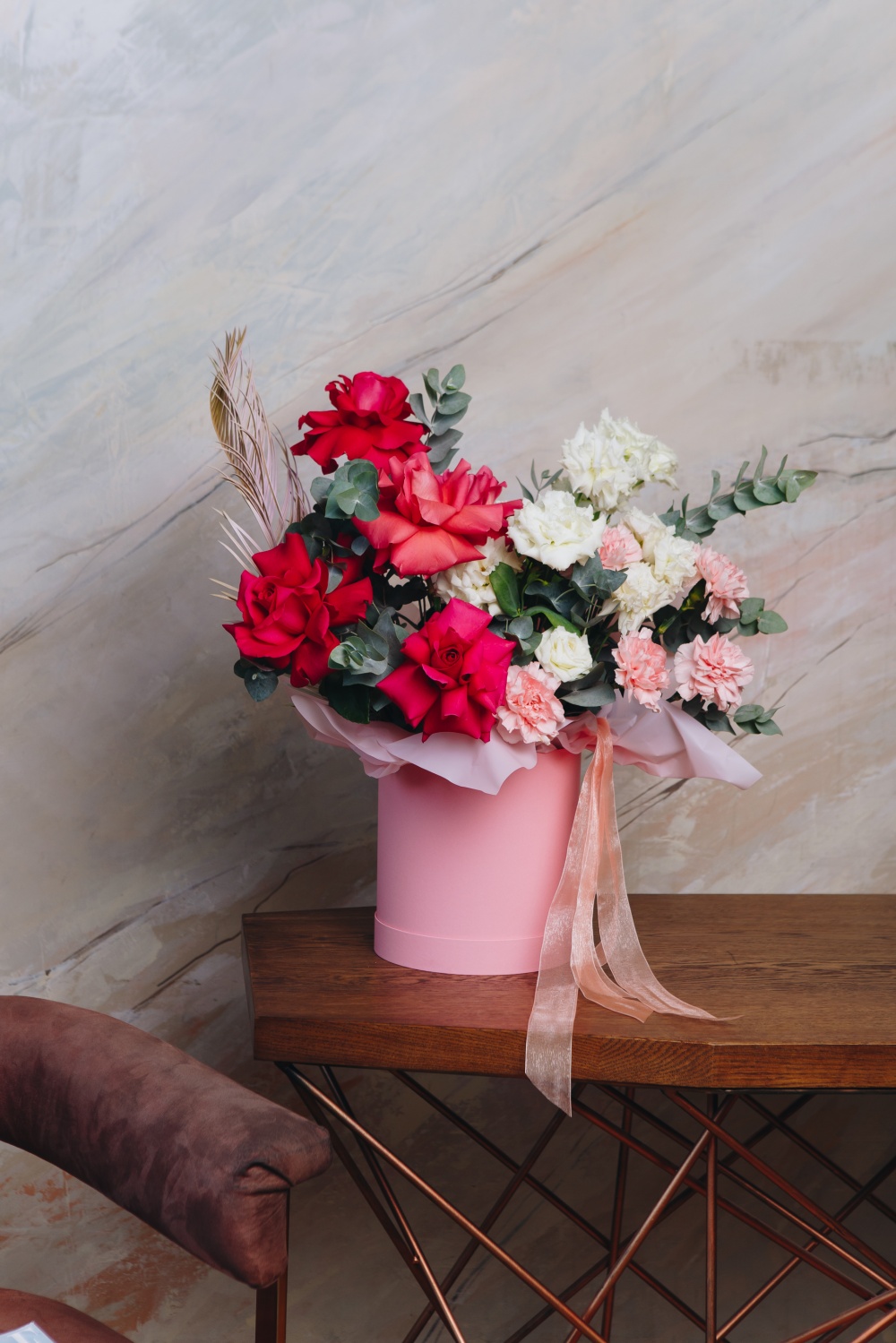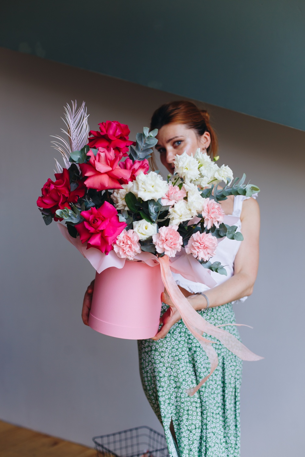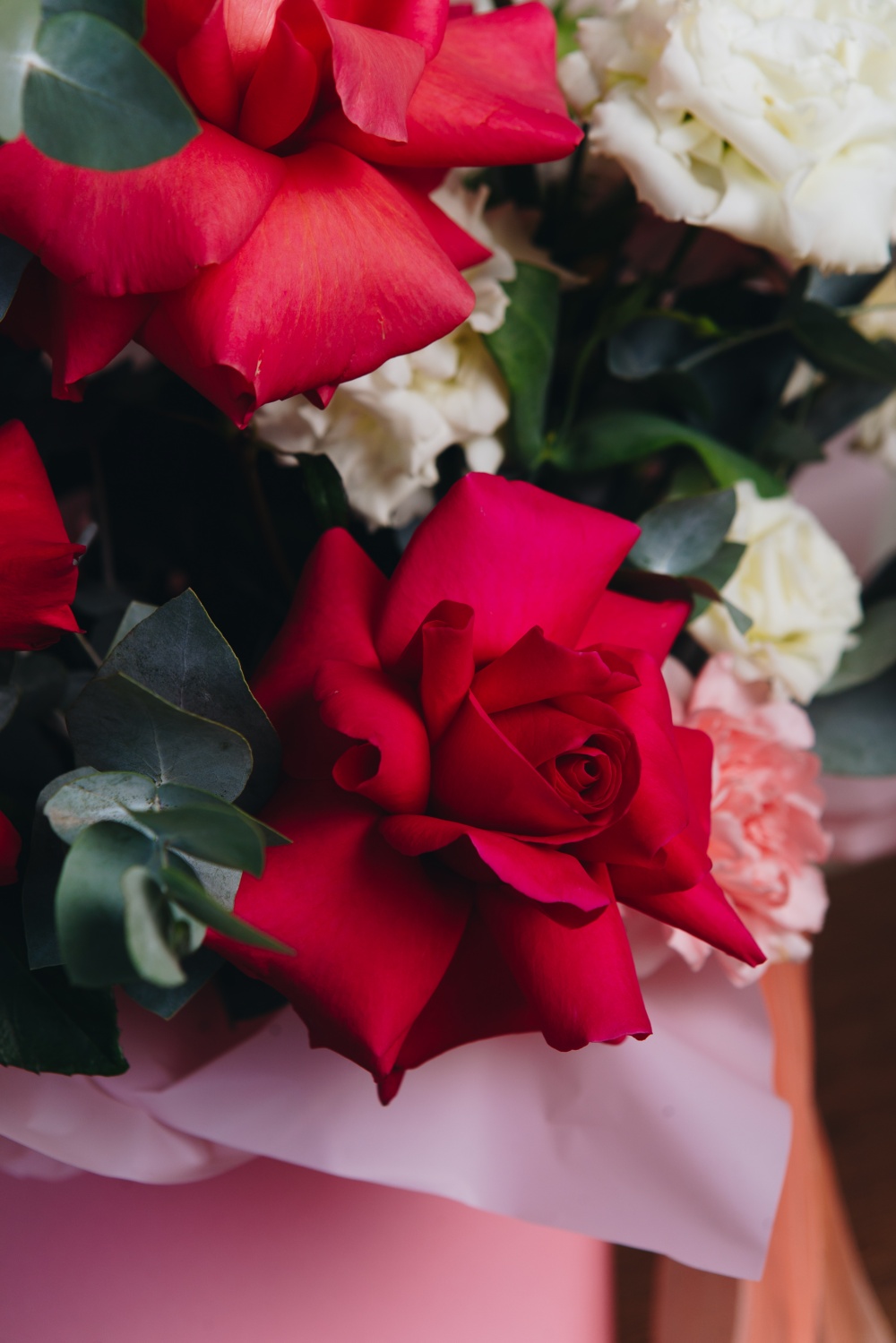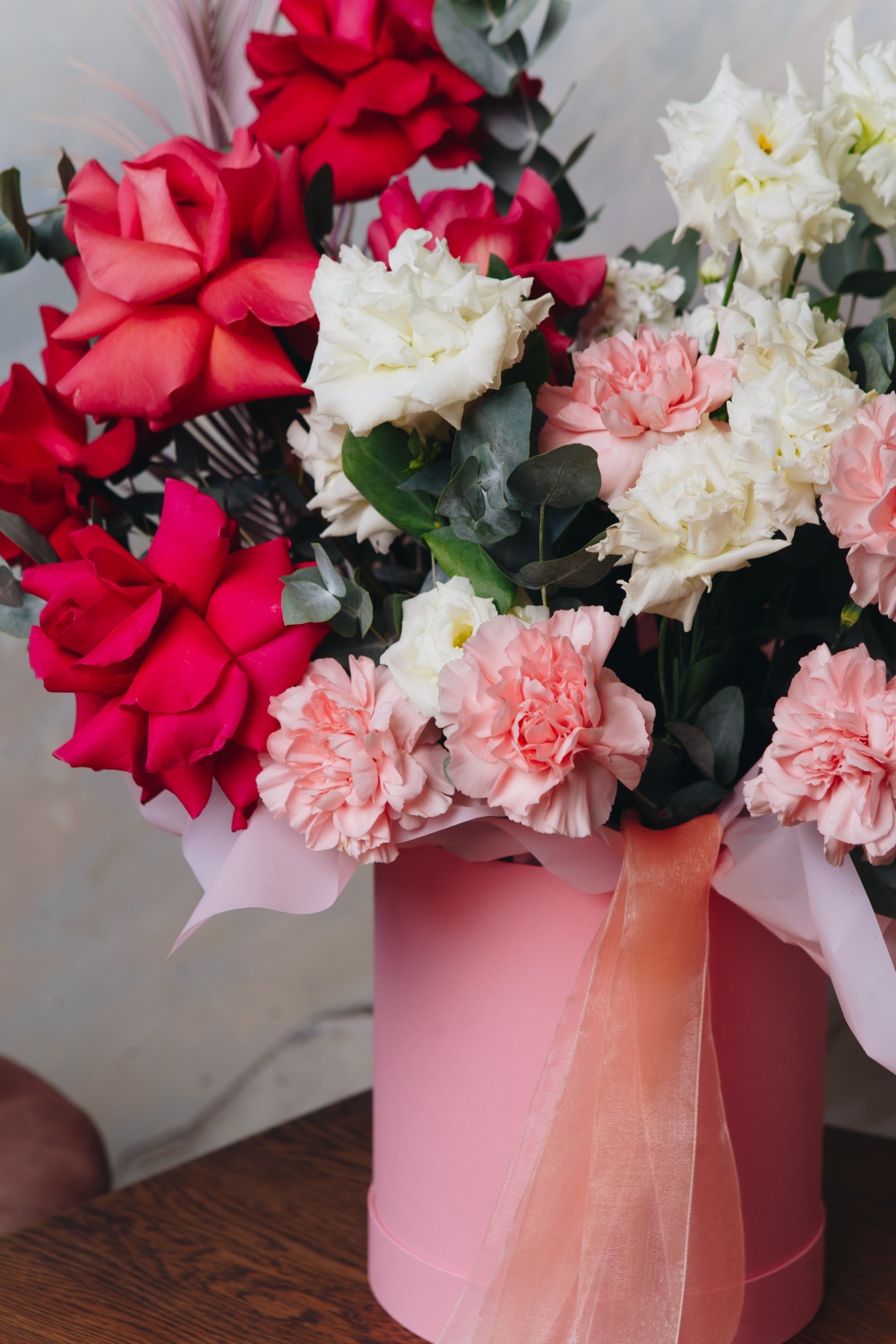 Роскошная композиция из ароматных роз, белоснежных лизиантусов и кремовых диантусов, ветки цикаса и душистого эвкалипта станет прекрасным подарком по любому поводу и без.