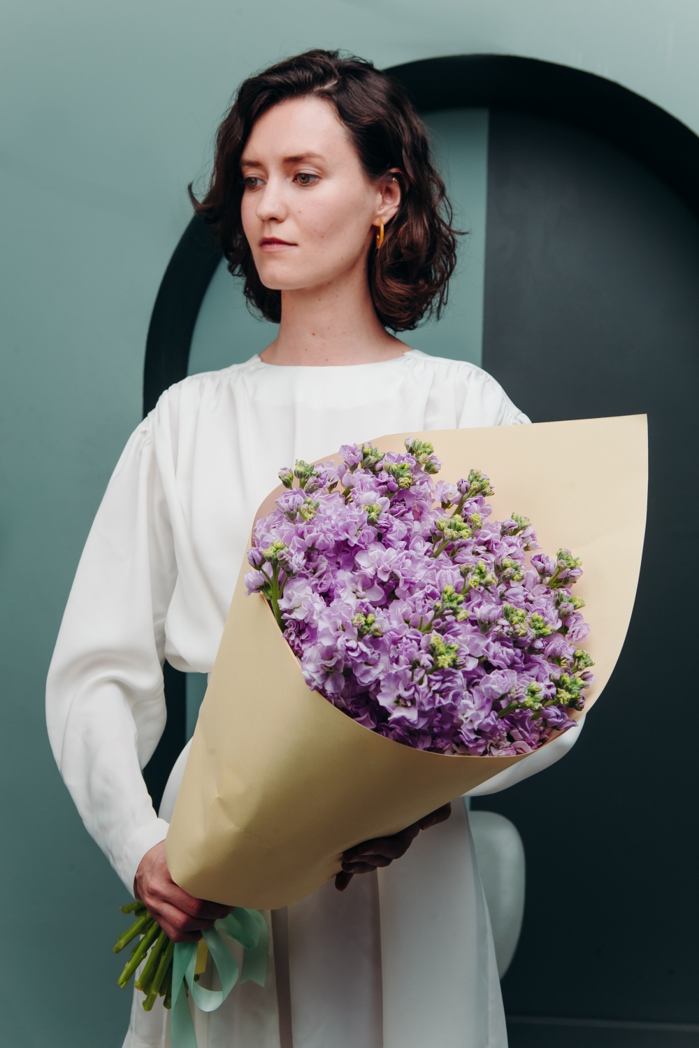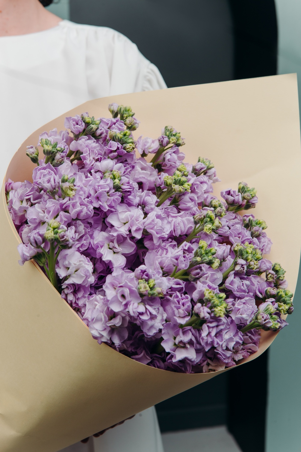 Букет маттиолы лавандового цвета. Аромат цветов маттиолы медово-цветочный. Упаковка из плотного светло-жёлтого цвета дополнена атласной лентой. В комплект входит: инструкция по уходу, открытка с вашими пожеланиями. Букет можно заказать с доставкой до двери или самовывозом из магазина. Доставка цветов по Москве бесплатно"