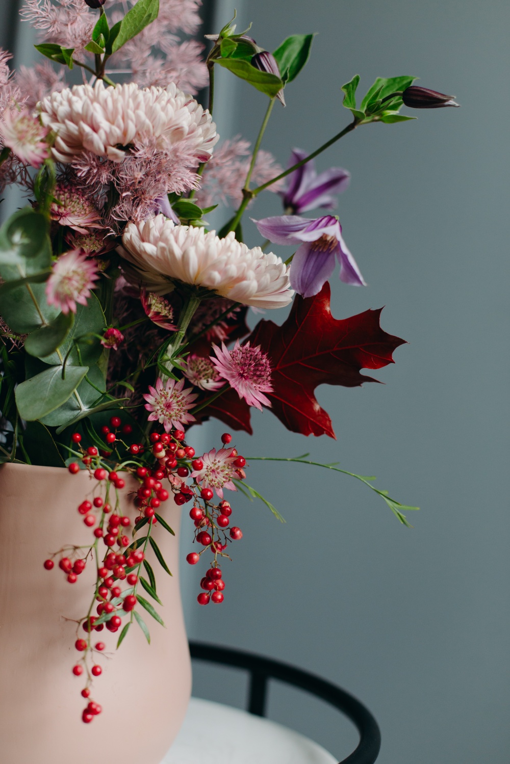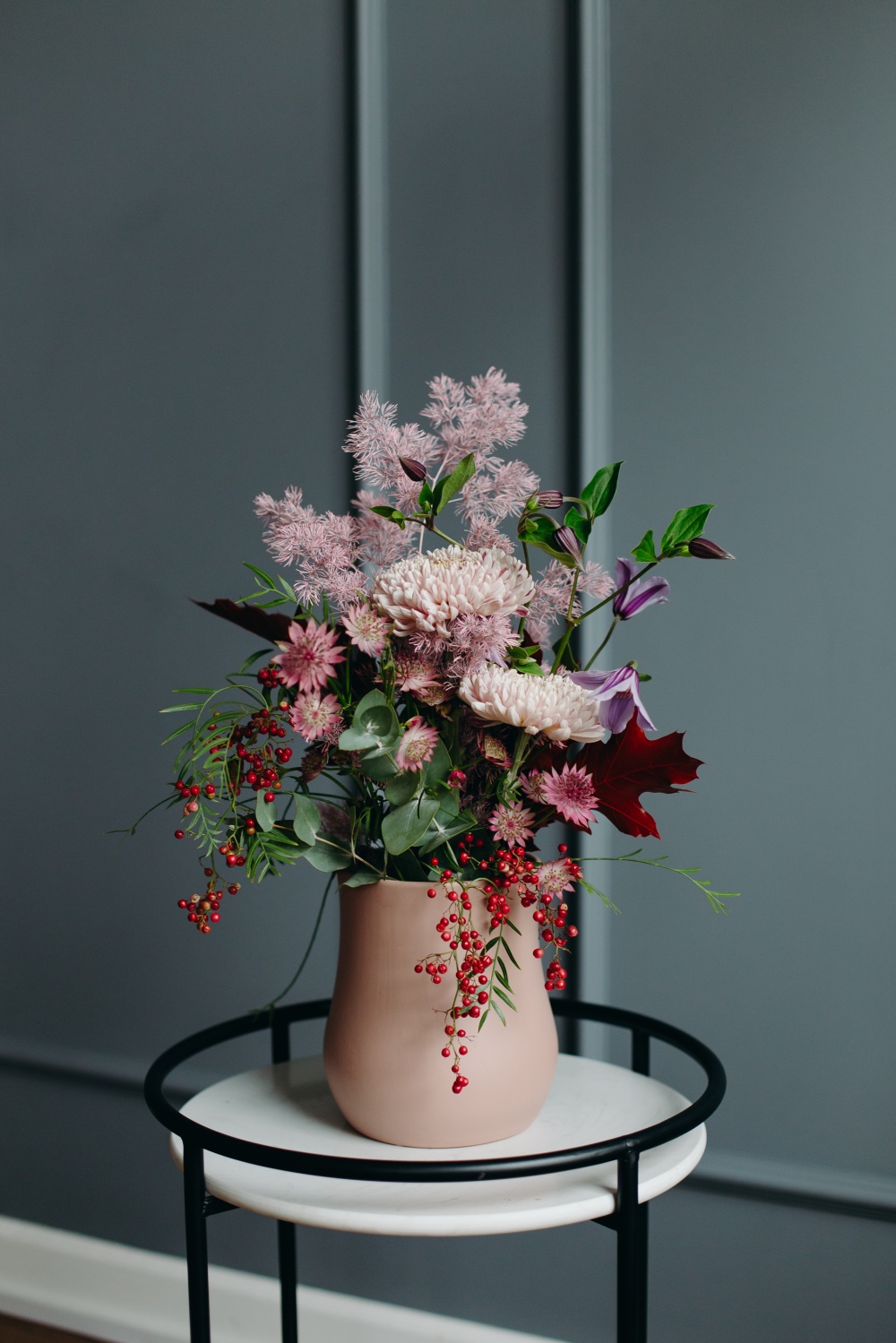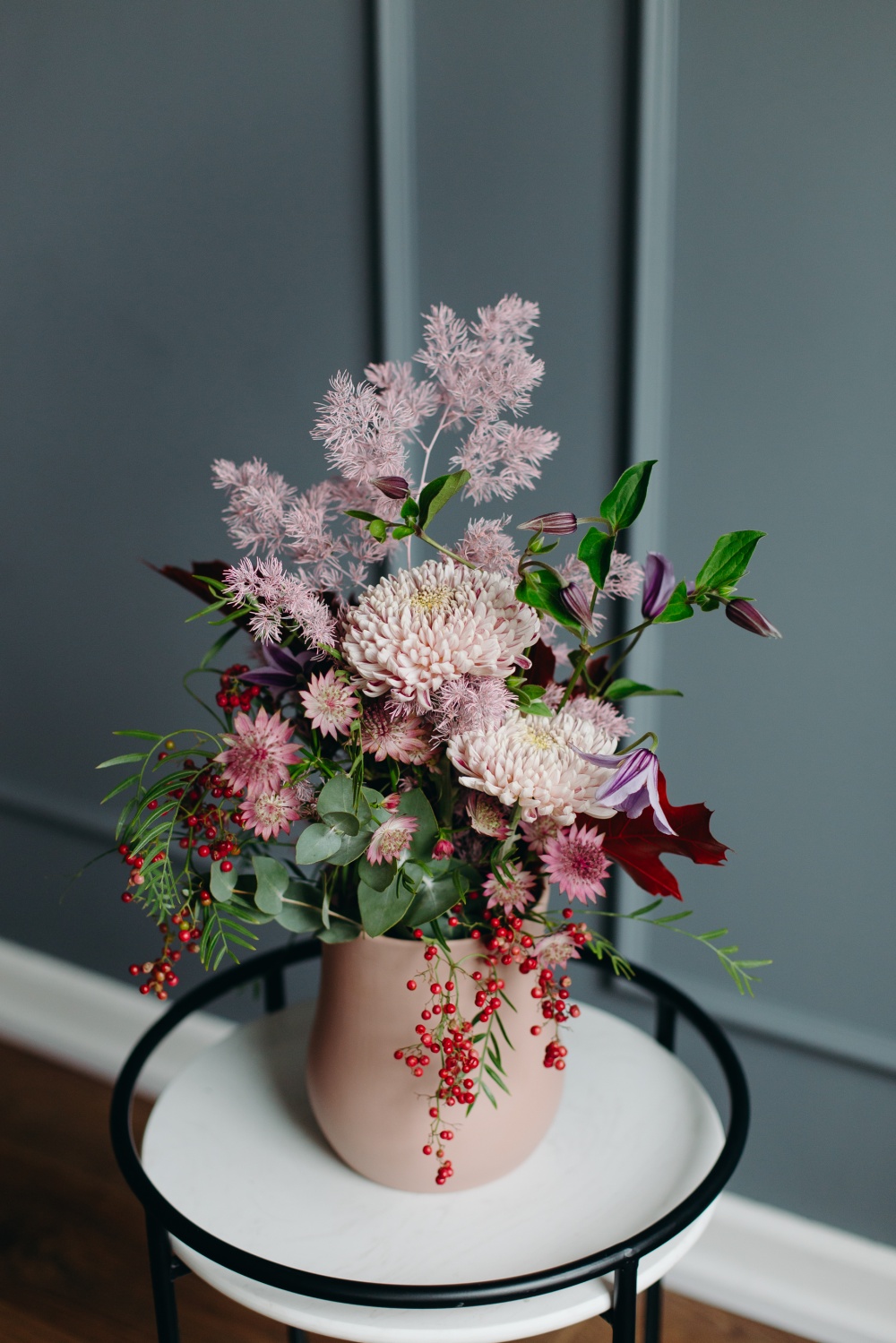 Композицию «Валенсия» заказать можно на нужную дату и время. Над ее созданием работают профессиональные флористы, поэтому она будет соответствовать всем пожеланиям заказчика. Тут преобладают роскошные цветы в розовых оттенках, их нежная красота оттенена красными ягодками, зеленью. А для формирования воздушности использован нежный декор.