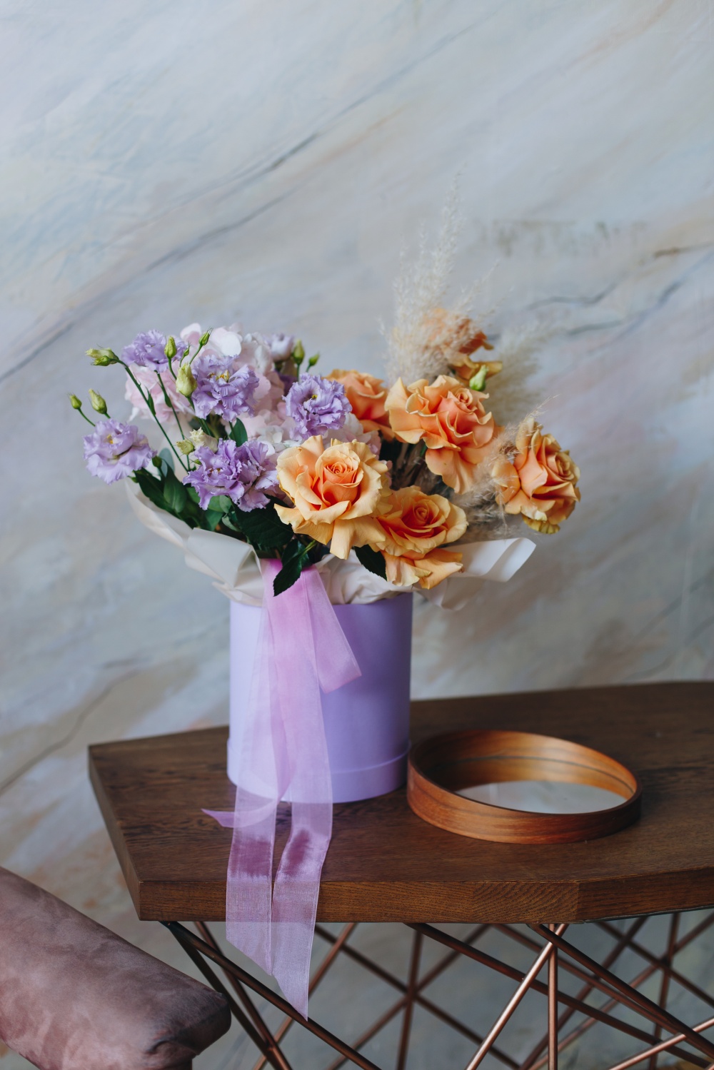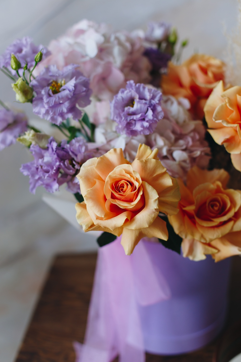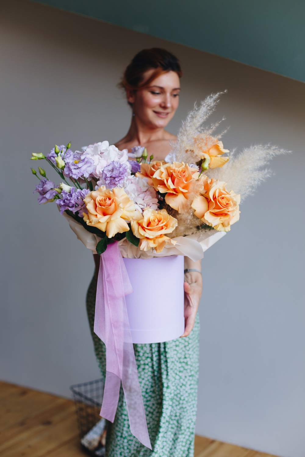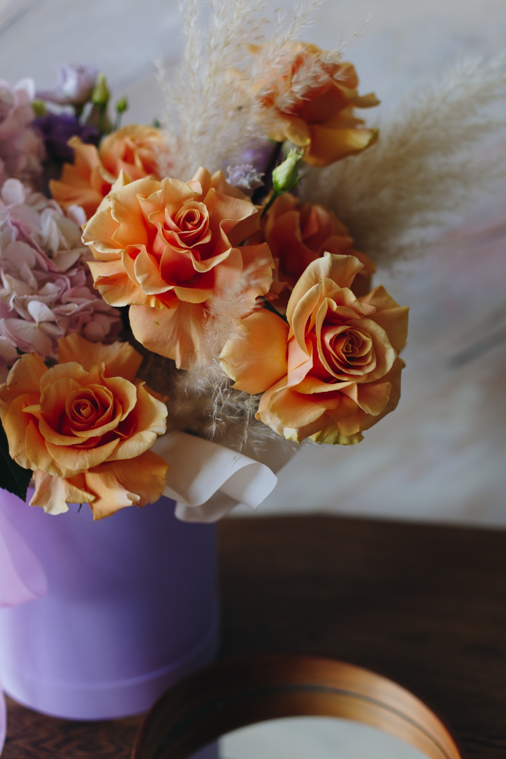Роскошная композиция из ароматных роз и лавандовых лизиантусов, крупных шапок гортензий и воздушной пампасной травы станет прекрасным подарком по любому поводу и без.