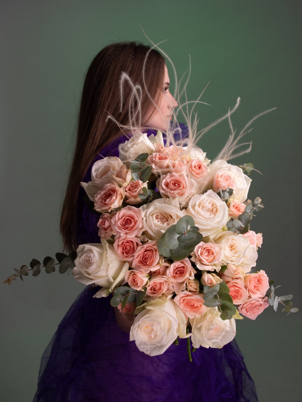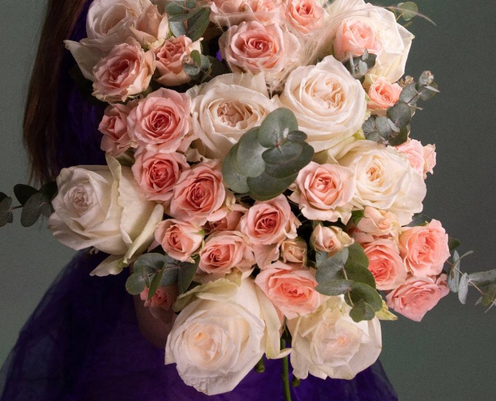Букет "Императрица" в кремово-розовой гамме. В состав букета входят ароматные пионовидные розы сорта "Вайт Охара", кустовые розы, стифа и свежий сизо-зелёный эвкалипт. Дополняет букет декоративная лента. В комплект входит: инструкция по уходу, открытка с вашими пожеланиями. Букет можно заказать с доставкой до двери или самовывозом из магазина. Доставка цветов по Москве бесплатно"