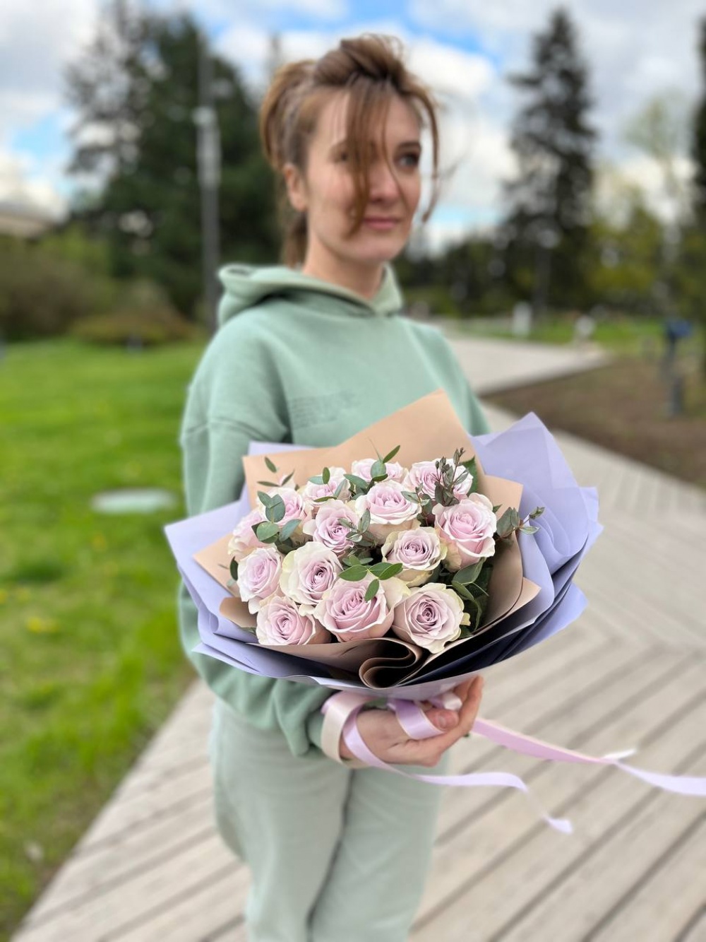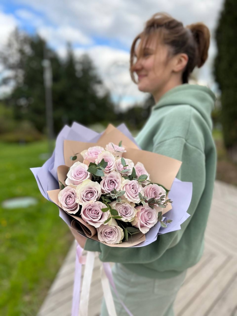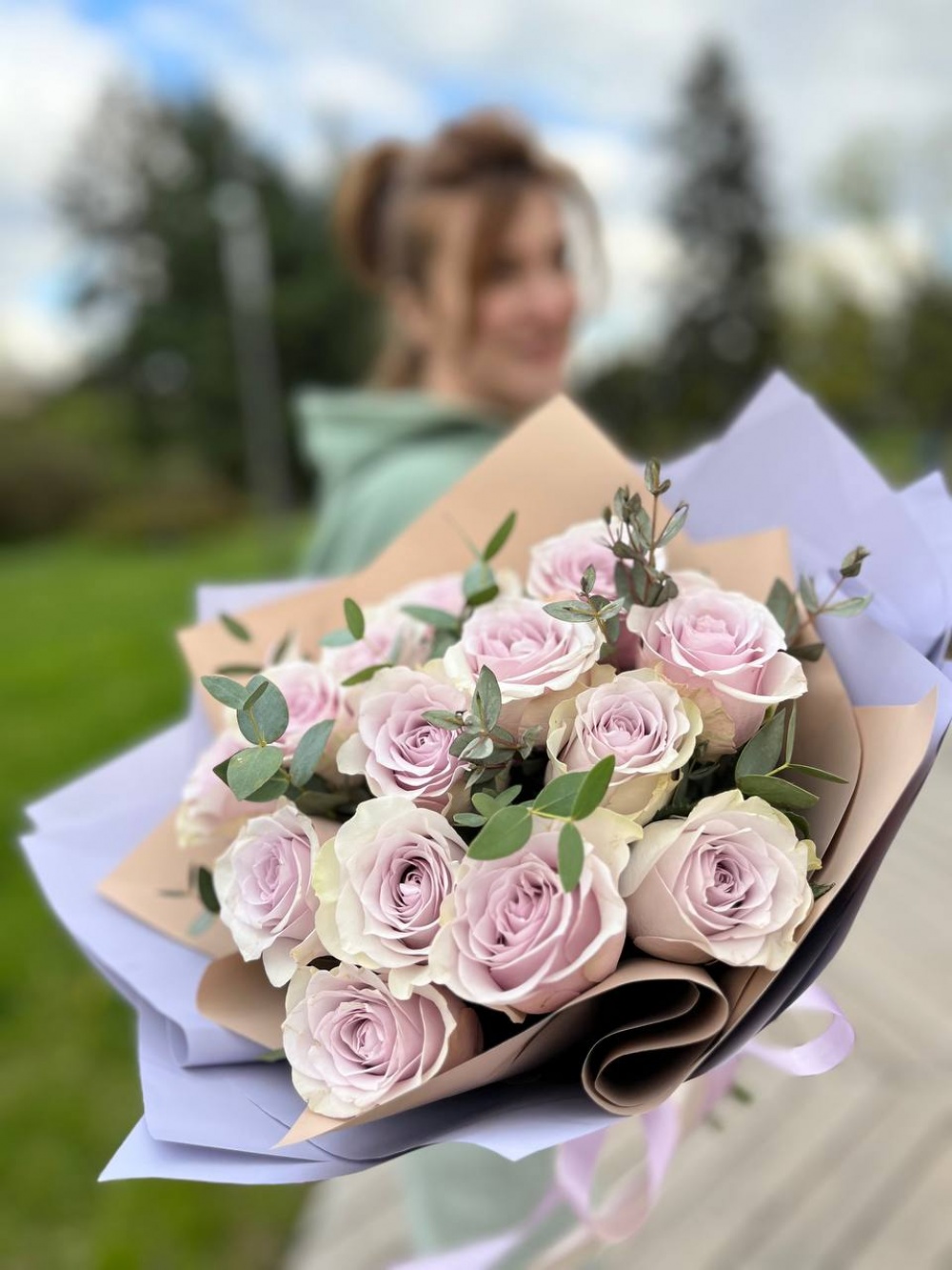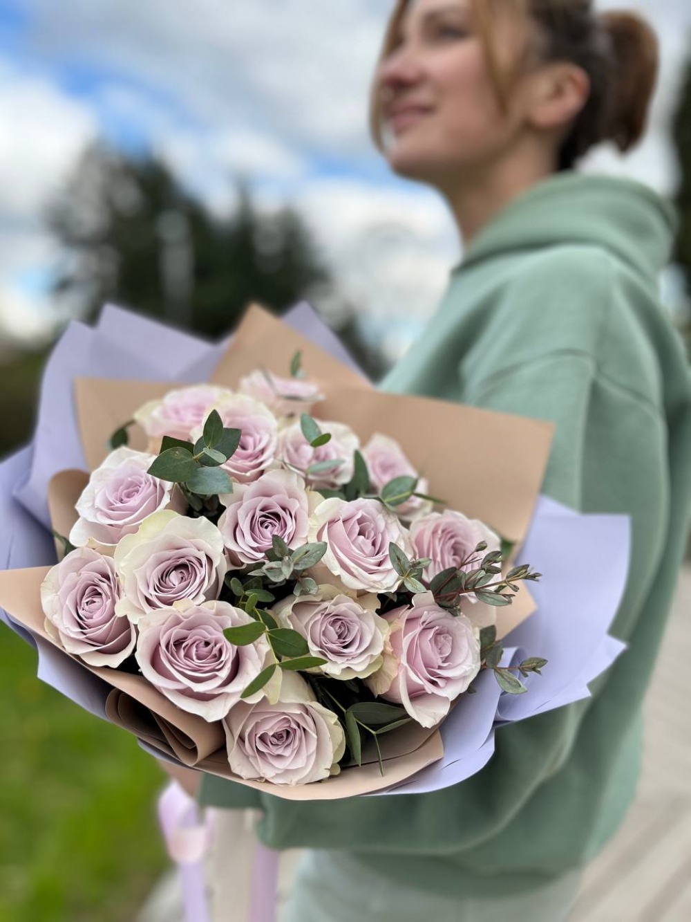 Букет из 15 пудрово-лавандовых роз в сочетании со свежим ароматным эвкалиптом для всех любителей нестандартных решений!